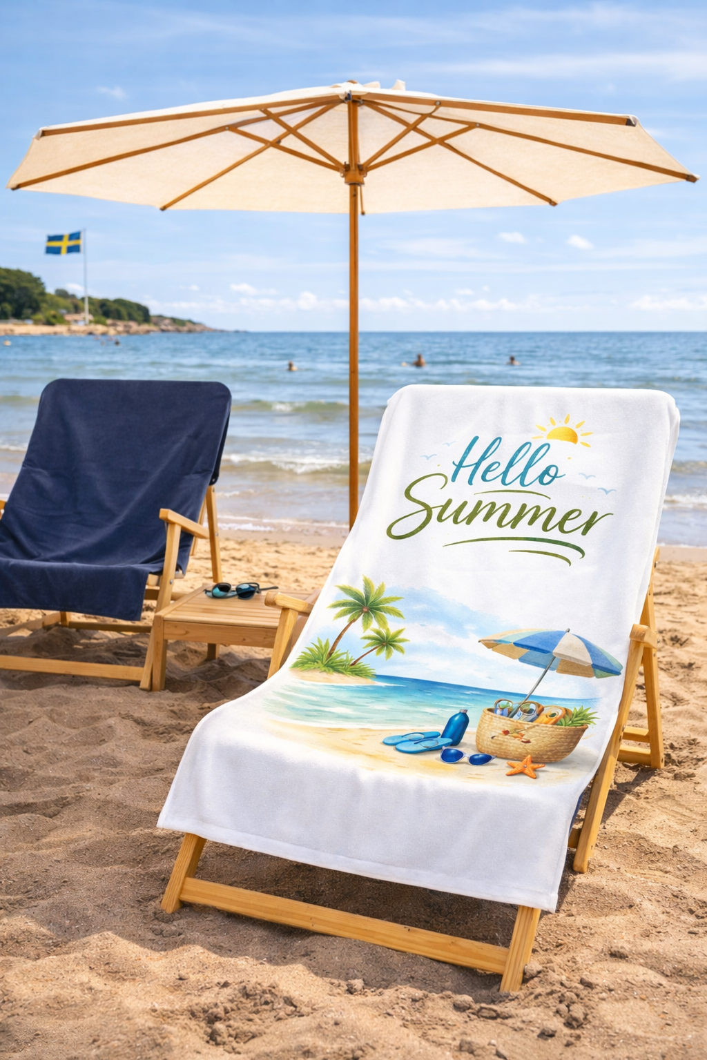 Designa en varumärkessmart handduk med tryck över hela ytan – perfekt för stranden, poolen och sommarens alla utomhusäventyr. Den träs enkelt över den klassiska brassestolen och sitter alltid på plats tack vare smart överhäng. Ditt varumärke syns tydligt – även när någon sitter på den. Tillverkad i Europa med fokus på kvalitet och hållbarhet. Ovansida i 100 % återvunnen rPET med högupplöst tryck och mjuk, absorberande baksida i 100 % bomull. Med en vikt på 400g känns den både lyxig och slitstark. Storlek: 80 x 160 cm + 20 cm överhäng. En smart, hållbar och stilren sommargåva som verkligen gör intryck.